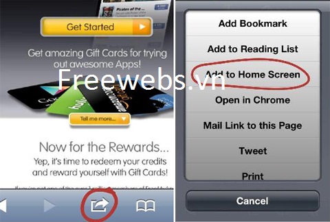 Trên màn hình bạn chọn nút lệnh Get Start, tiếp tục chạm vào nút chuyển bên dưới và chọn Add to Home Sreen. Trình duyệt sẽ tự động chuyển đến màn hình cài đặt. Bạn nhấn install, sau quá trình cài đặt, màn hình home sẽ hiển thị biểu tượng chương trình FreeMyApp.