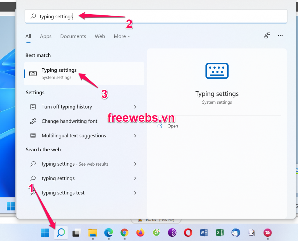 Hãy làm theo từng bước 1-2-3 như trên hình vẽ để mở Typing Settings