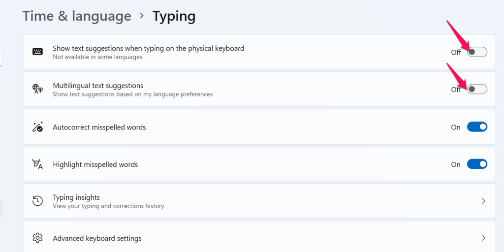 Các bạn hãy tắt các nút và bật các nút giống như trong hình để vô hiệu hóa bộ gõ sẵn có trong windows 11, sau đó các bạn hãy gõ thử các từ tiếng việt xem hãy gõ thử khám phá địa điểm hãy in nhanh, hoặc nối mi đẹp trẳng hạn.