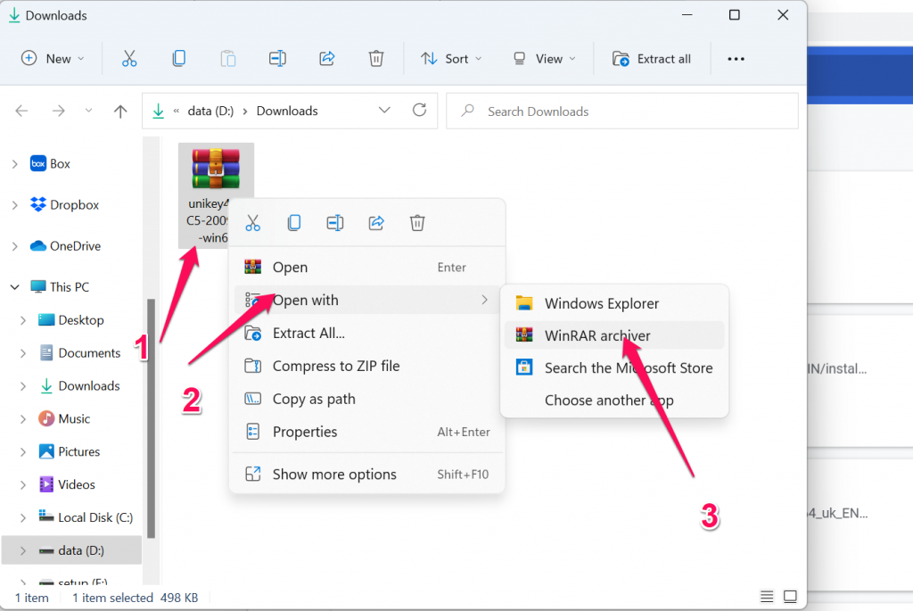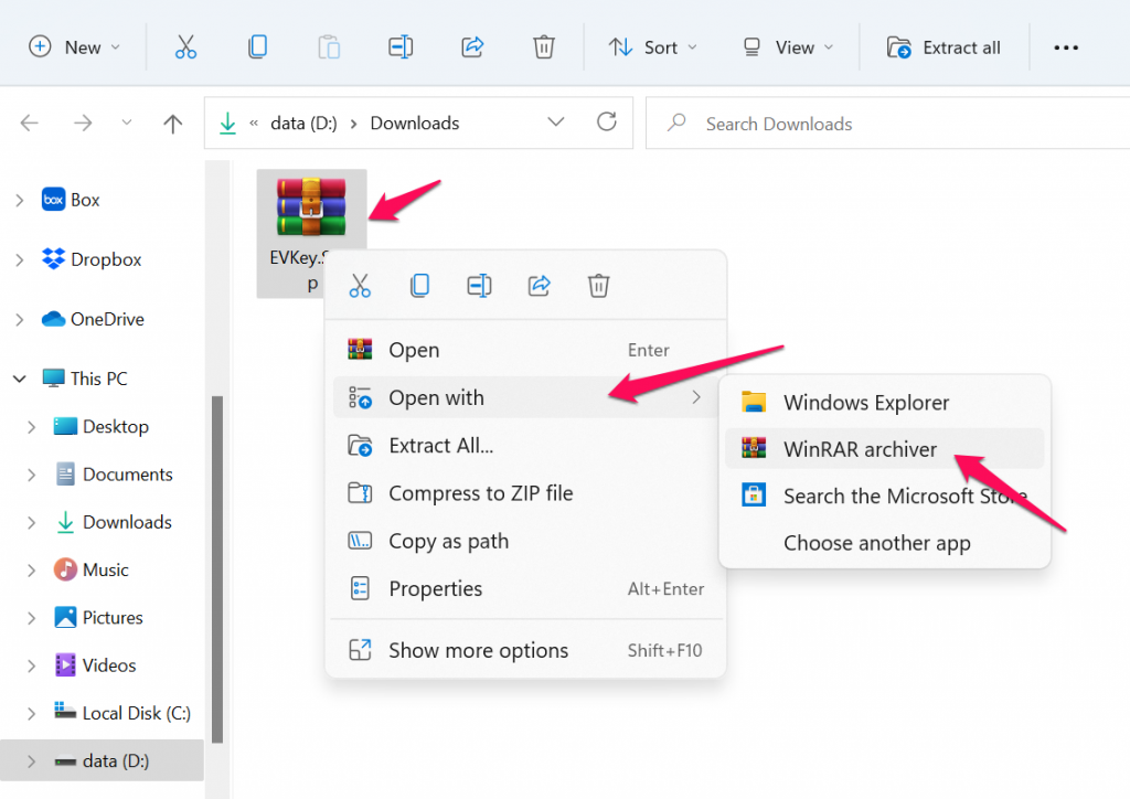 Các bạn bấm vào file vừa tải bấm chuột phải rồi Open with chọn tiếp WinRAR archiver