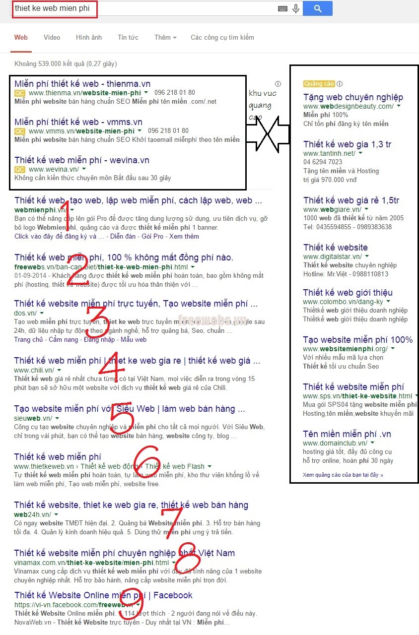 Bây giờ chúng ta hãy vào google.com.vn gõ từ khóa “thiet ke web mien phi” và đây là kết quả em nó.