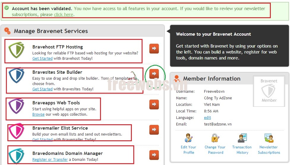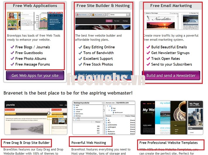 Ta dễ dàng nhận thấy Bravenet cung cấp rất nhiều dịch vụ, bao gồm dịch vụ hosting free, website buil free, web tool, dịch vụ Email, và quản lý domain hay còn gọi là tên miền.