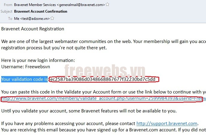 Hãy quay trở lại email mà lúc trước các bạn đăng ký, hãy mở email mà bravenet.com gửi cho bạn cũng như Your validation code is và link để kích hoạt giống như thế này.