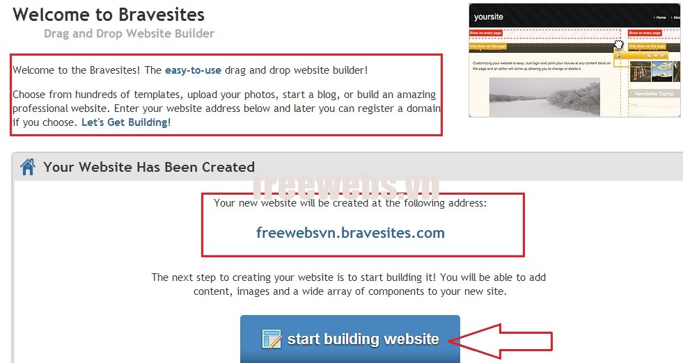 Chúng ta nhận được dòng thông báo là chào mừng bạn cùng với đó là link website và bắt đầu xây dựng website theo ý của bạn thôi.