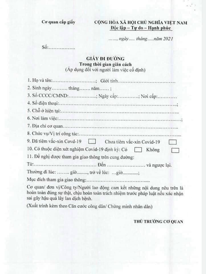 Theo đó, bắt đầu từ 12 giờ 00 phút ngày 6-8-2021, thống nhất sử dụng Giấy đi đường trong thời gian thực hiện giãn cách xã hội trên toàn địa bàn thành phố theo mẫu mới. Giấy đi đường phải có xác nhận của cơ quan có thẩm quyền mới có hiệu lực.